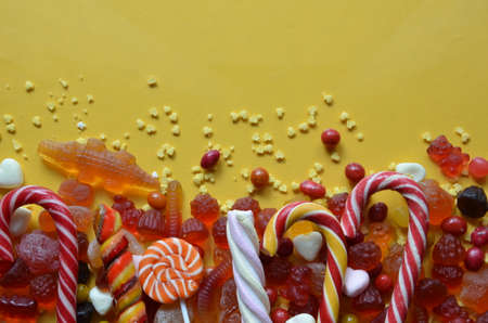 candies with jelly and sugar. colorful array of different childs sweets and treats on yellow background. red marmalade in the shape of a heart with a variety of caramels and candies, marshmallows. Abstract. top view copy space