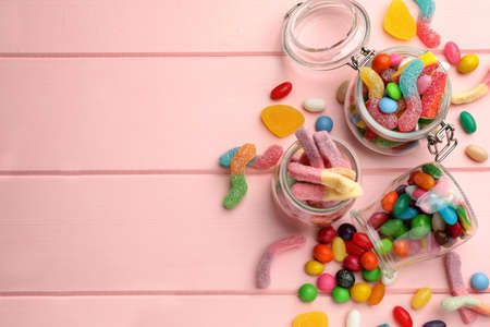 Jars with different delicious candies on pink wooden table, flat lay. Space for text