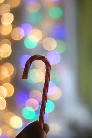 Hand holding a candy cane in front of colorful Christmas lights. Selective focus.