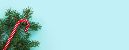 spruce branches and red candies on a blue background. Flat lay, top view, copy space, diagonal. christmas concept, holiday postcard. modern, trendy design. banner