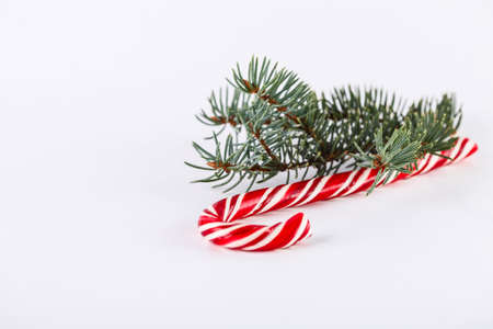 Christmas winter background with three evergreen branches and three sweet candy canes on white background.