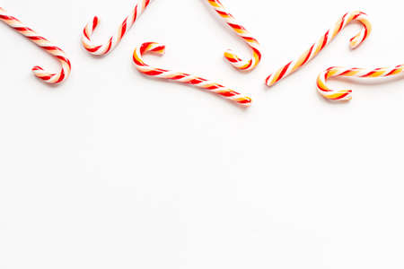 Christmas Candy canes with striped rope bow and on white wooden table background with snowflakes. Sweet Christmas Card with copy space