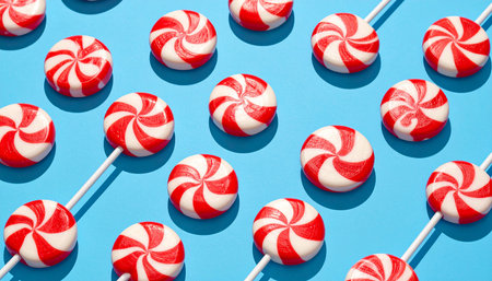 Red and white swirl lollipops are scattered in a pattern across a bright blue surface.