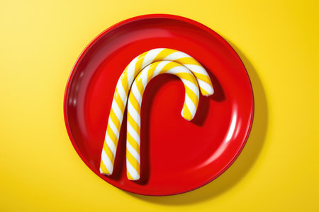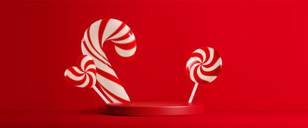 Candy cane and spiral lollipop on red round podium - 3d rendered festive sweets with white stripes and swirl patterns. Holiday confectionery display on crimson backdrop for confectionary design.