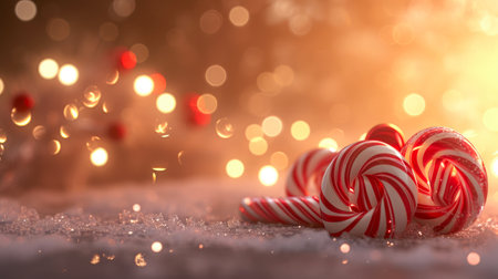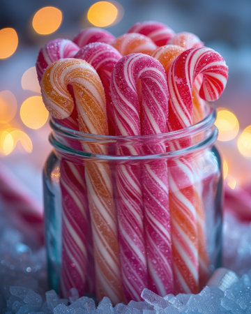 Colorful candy canes arranged in a glass jar, surrounded by sparkling ice and soft bokeh lights, creating a festive and cheerful ambiance perfect for holiday celebrations and sweet treats