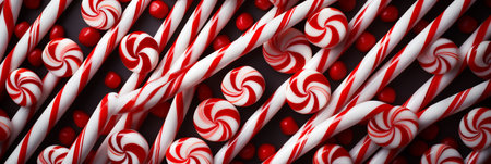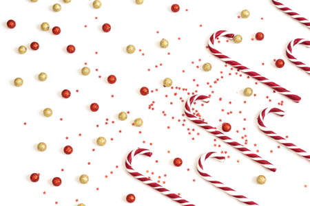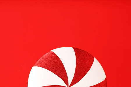 Christmas celebration striped red and white hard candies on red backgraund. Flat lay style.