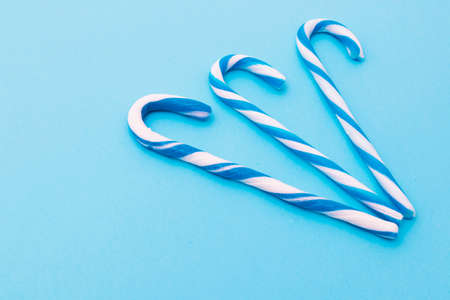 Hard cane-shaped candy sticks with traditional white and red stripes, flavored with peppermint is very popular during Christmas holidays. Blue background.