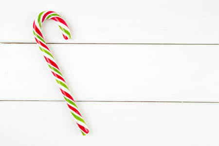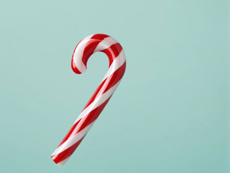 This image features a single candy cane prominently displayed against a white background. The candy cane has a classic red and white striped pattern. The image is clear and SEO-friendly, ideal for various holiday-themed applications.