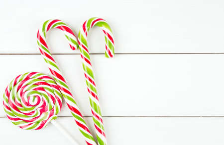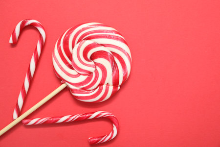 Christmas treat. Lollipop and candy canes on red background, top view. Space for text