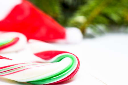 Christmas fir tree branch with Santa hat and Xmas candy cane on white wooden background. Xmas presents concept and copy space. Christmas border or greeting card
