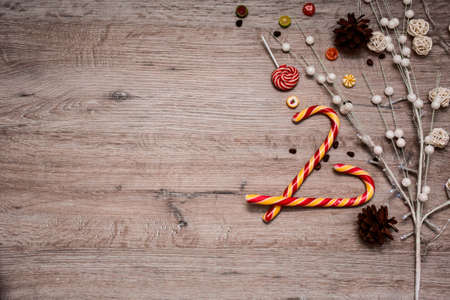 Traditional candy canes on wooden background. New Year and Christmas concept