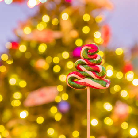Christmas background. Caramel, bokeh, blur. Candy cane on blurred Christmas lights background