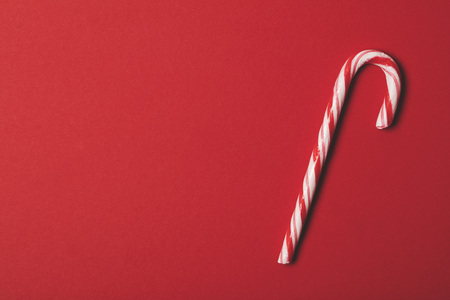Festive Christmas treat. Flat lay of striped red candy cane isolated on white background. Copy space.