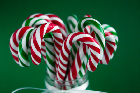 Candy canes close up. Christmas background. Green and red sweet sticks in the glass jar with white ribbon. Poster, banner, greeting card template. Festive backdrop. Holiday season