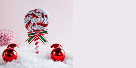Banner christmas card with lollipop and red bauble balls in snow. Copy space.