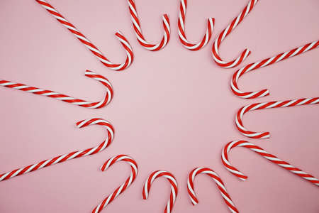Sugar caramel cane on a pink pastel background. Copy space for text. Flat lay. Pattern, card, frame. Candy Cane Day Poster, December 26. Sweet Christmas symbol.