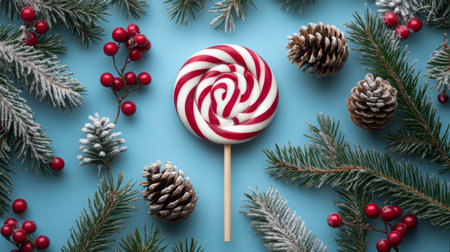 A vibrant swirled lollipop rests among holiday decorations like pine cones and ornaments, creating a delightful festive scene on a rustic wooden surface.