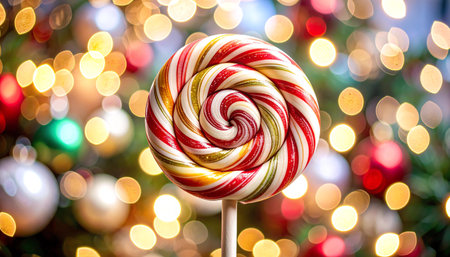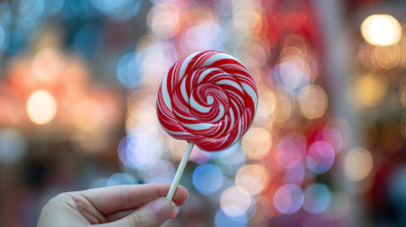 A vibrant red and white swirl lollipop held in a hand, set against a beautifully blurred background of holiday lights creating a cheerful and festive ambiance.