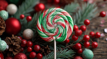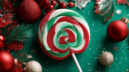 A vibrant swirl lollipop in cheerful red and green colors sits amidst festive decorations, creating a perfect holiday atmosphere filled with joy and sweetness.