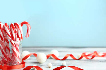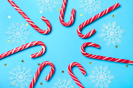Flat lay of delicious sweet Christmas candy canes on blue background with copy space for Christmas advertising. Decoration for 25 december