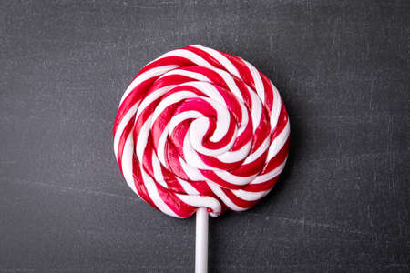 A large candy cane lollipop with red and white stripes is placed on a blue background