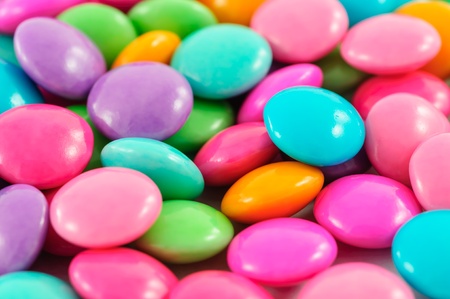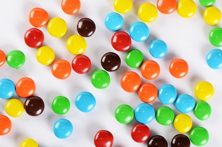 Background with scattered multicolored chocolate candy and sugar candy. Toned image