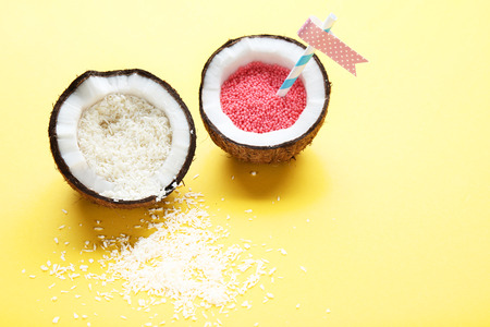 Coconut with sprinkles and flakes on yellow background