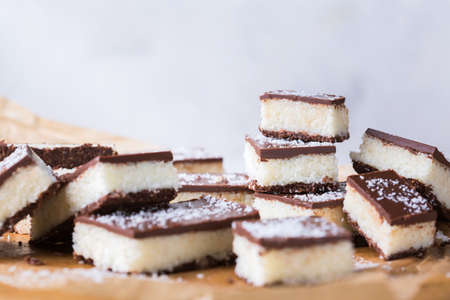 Homemade healthy energy organic raw vegan coconut bars with chocolate on a kitchen table
