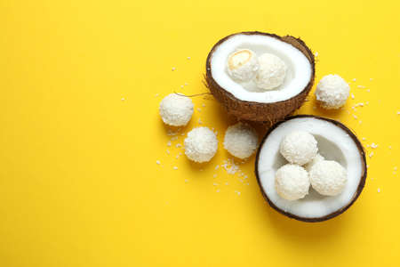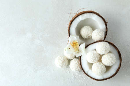 Concept of tasty sweets, coconut candies, space for text