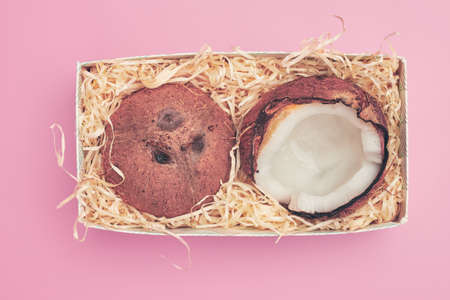 in a box coconut on a pink background isolate, copyspace, layout