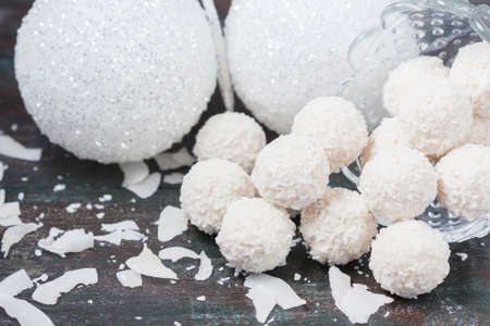 White Christmas balls and coconut sweets. Selective focus
