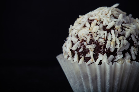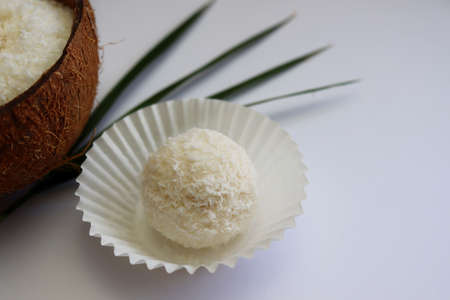 Tasty candies in coconut flakes and fresh nut, closeup