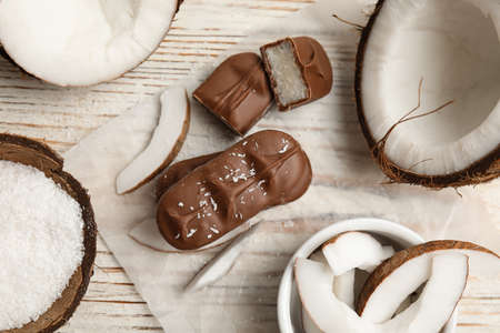 Delicious milk chocolate candy bars with coconut filling on white wooden table, flat lay