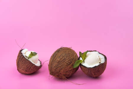 Ripe coconut cut on two half isolated on pink background. Fresh fruit, ingredient for cooking food or beauty self care