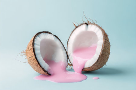 Coconut halves lay open, showcasing vibrant pink milk pouring out onto a soft blue background, creating a playful yet calm aesthetic.