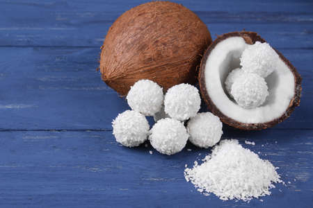 Coconut and half coconut with coconut candies on a blue wooden background