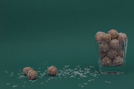 Dietary healthy snack in coconut flakes in a transparent glass cup. Three energy balls and coconut flakes lie next to the glass. Horizontal view. Side view. Copy space. Dark background.