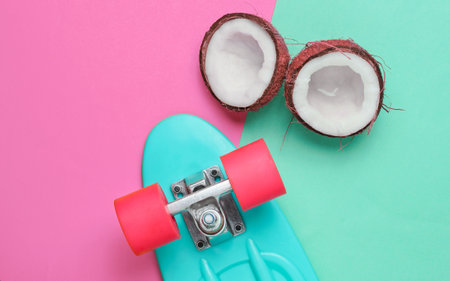 Creative summer concept. Skateboard, coconut halves on blue pink pastel background, top view