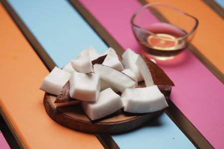 Fresh coconut pieces on a wooden board with syrup