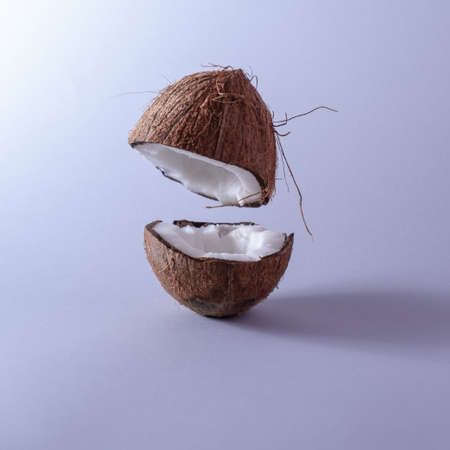 Half of broken coconut on blue background, summer background, tropical fruit minimal concept