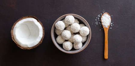 Healthy food concept. Homemade coconut energy balls in cocnut shell on wooden background