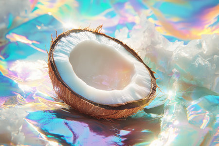 Half of a coconut rests on iridescent foil, surrounded by fresh coconut shavings, showing vibrant textures.