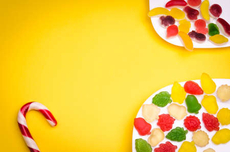Colorful assortment of candies in shape of frame on yellow background. top view, copy space