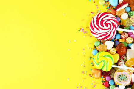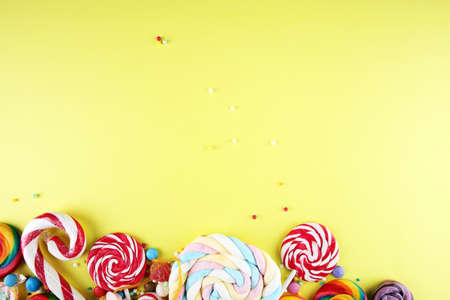 Colorful lollipops and different colored round candy on yellow