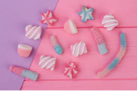 Marshmallows and jellies on color background. Composition with colorful candies on pink wooden background.