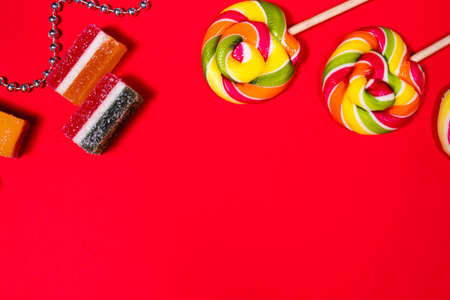 Candy, lollipops, multi-colored marmalade on a red background with a place for text layout