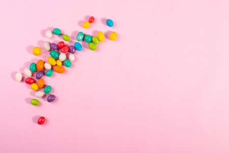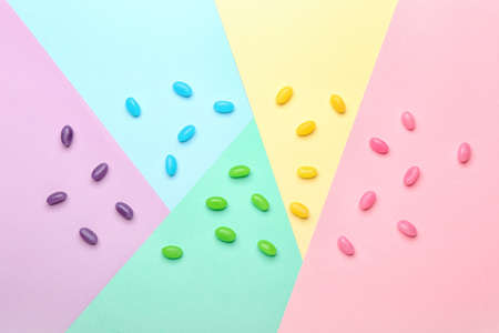 Colorful candies and jelly beans on colorful background. Top view.