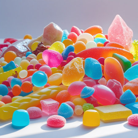 A delightful flatlay of assorted candies showcasing vibrant colors and unique shapes. Perfect for festive occasions, advertisements, or sweet-themed projects.