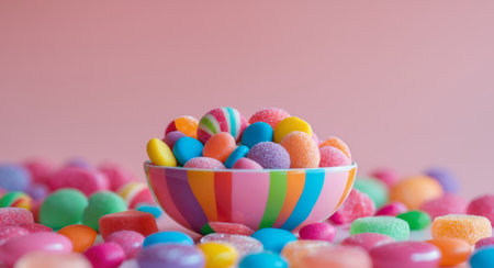 AI Generated. Colorful Sweet Candy Bowl on Pink Background
