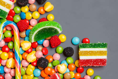 Colorful candies, jelly and marmalade over stone background. Top view with copy space